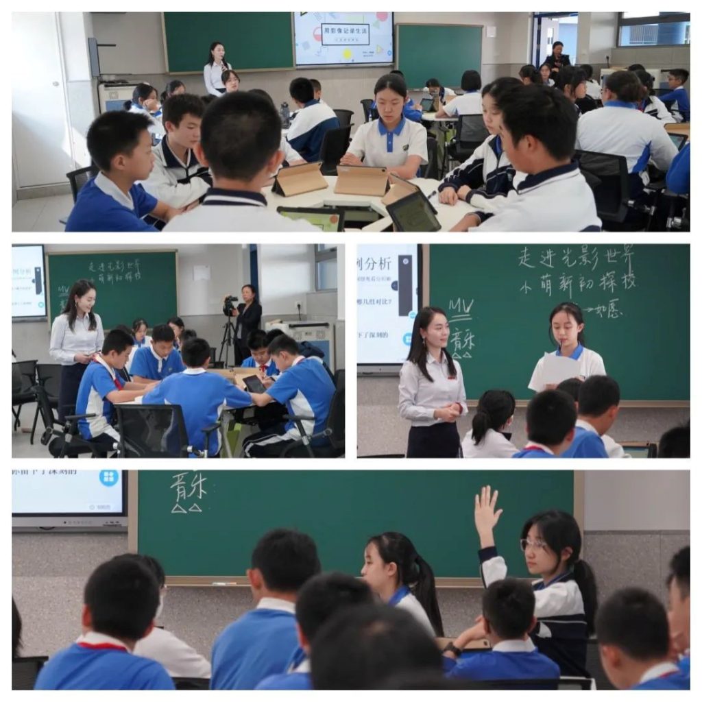 ? ? ? ? 信息技術(shù)學(xué)科組袁晨成老師為大家?guī)砹艘惶弥腔壅n堂融合影視藝術(shù)的綜合實踐大單元主題課程——《用影像記錄生活:小萌新初探?!贰W(xué)生在課堂上通過小組討論分析影視MV作品的表達(dá)技法和思想內(nèi)核,教師通過教學(xué)投票、作品展示引導(dǎo)學(xué)生全員參與、分享展示,主動提煉出影視作品常用表現(xiàn)手法。最后學(xué)生通過老師發(fā)布的智慧學(xué)習(xí)包,在學(xué)習(xí)引導(dǎo)和學(xué)習(xí)資源的幫助下,當(dāng)場創(chuàng)作了一段MV作品。教師借助實時學(xué)情及時調(diào)整教學(xué)策略,通過發(fā)起教學(xué)投票,引導(dǎo)學(xué)生全員參與進行生生互評。